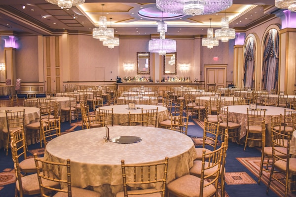 مجموعة طاولات مستديرة + كراسي مبطنة تكفي 50 شخص. مع أغطية....